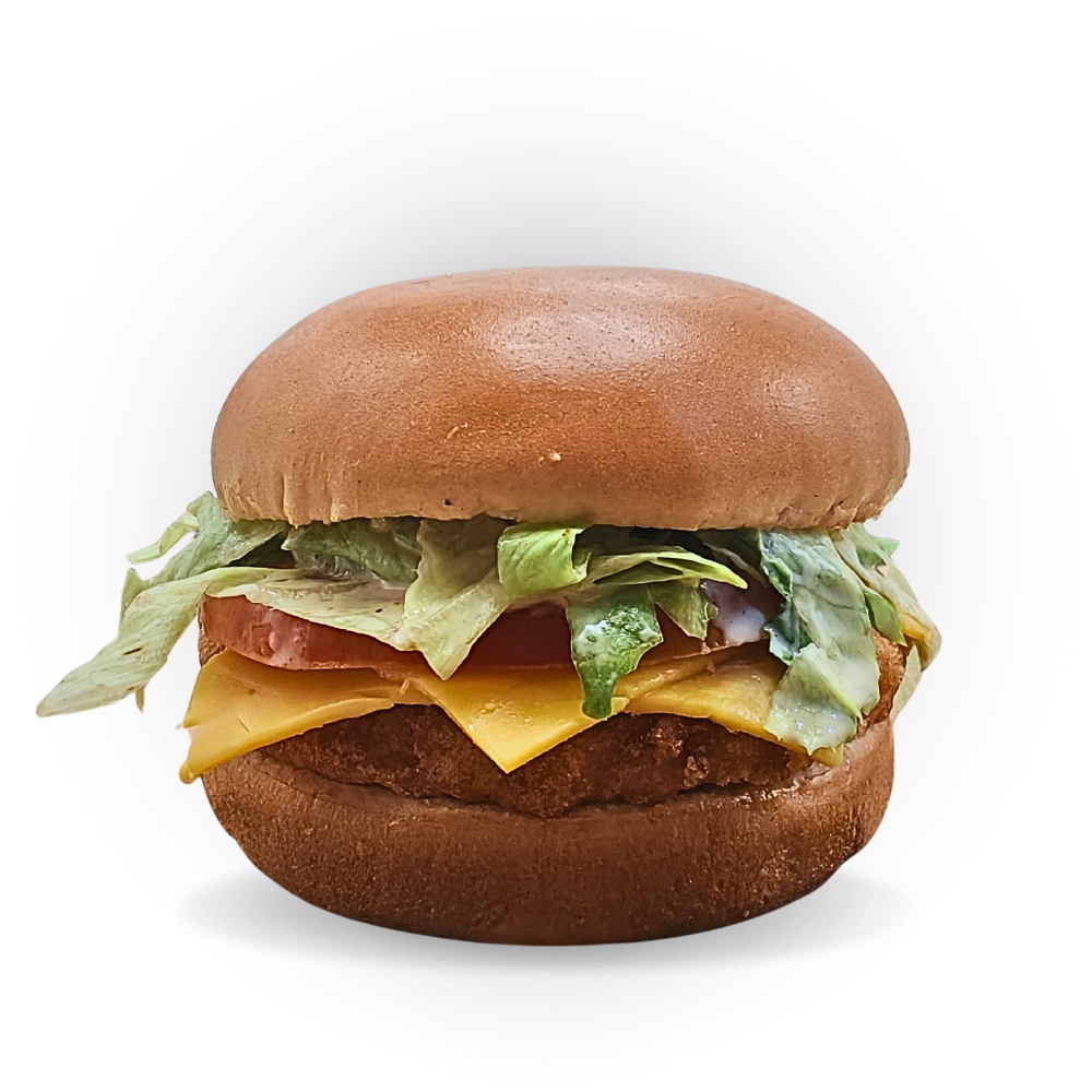 Pão de brioche, hambúrguer de frango empanado, queijo cheddar, alface e tomate fresquinho e maionese da casa artesanal.
