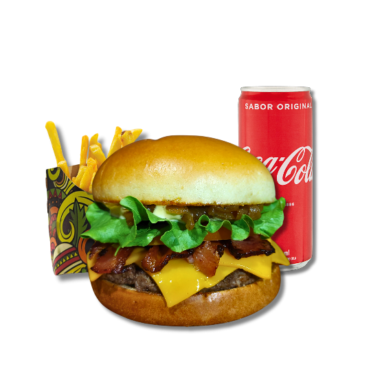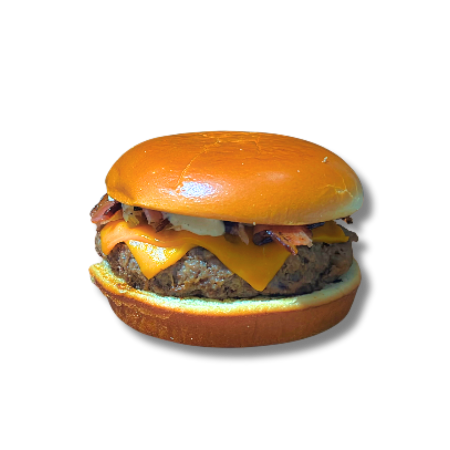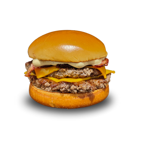 Pão de brioche, 2 smash bovino, queijo cheddar, tiras de bacon, e maionese da casa.