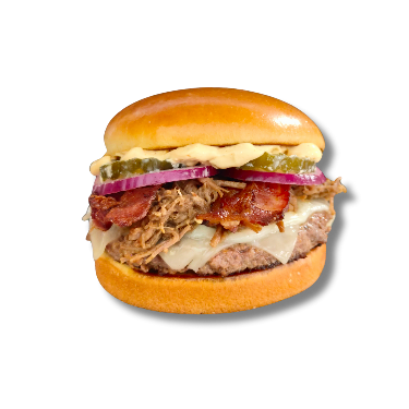 Pão de brioche, hambúrguer de 150g, costela desfiada, queijo mussarela, cebola roxa, picles, bacon e maionese da casa.