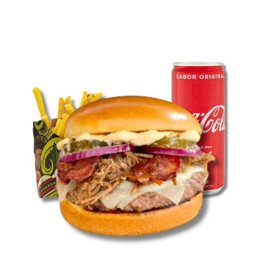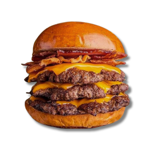 Pão de brioche, 3 smash bovino, queijo cheddar, cebola caramelizada, picles, bacon, e maionese da casa.