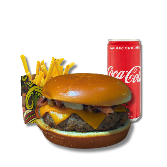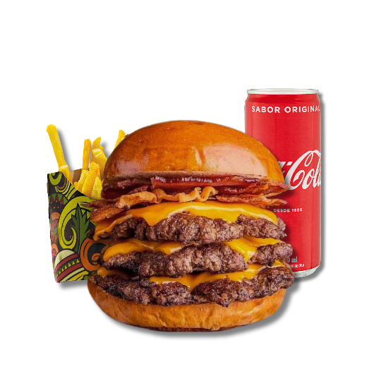Triplo Smash acompanhado de batata frita mais bebida à escolha.