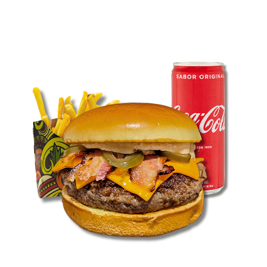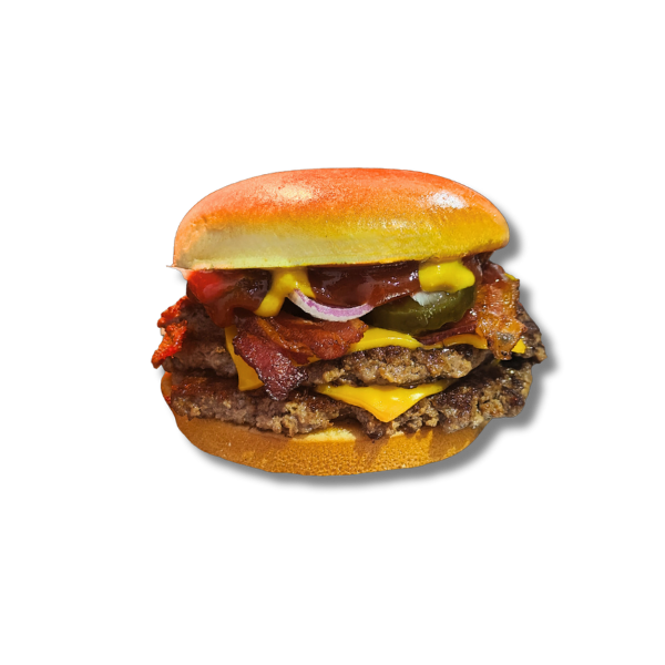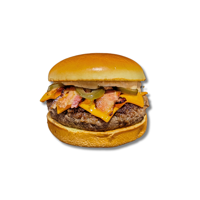 Hambúrguer de 150g, queijo cheddar, bacon, picles de pimenta jalapeno, e maionese defumada picante.