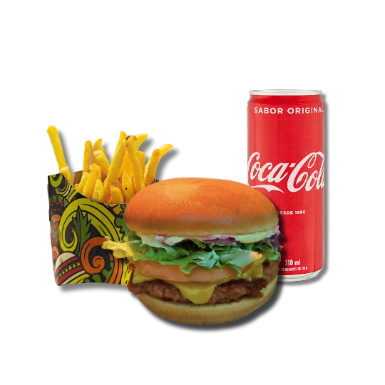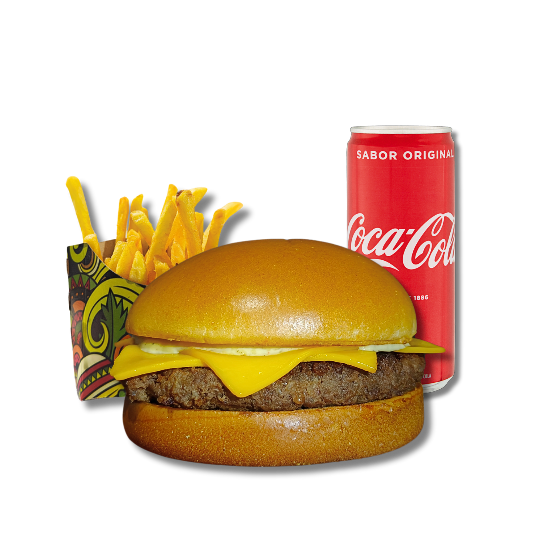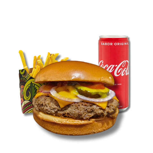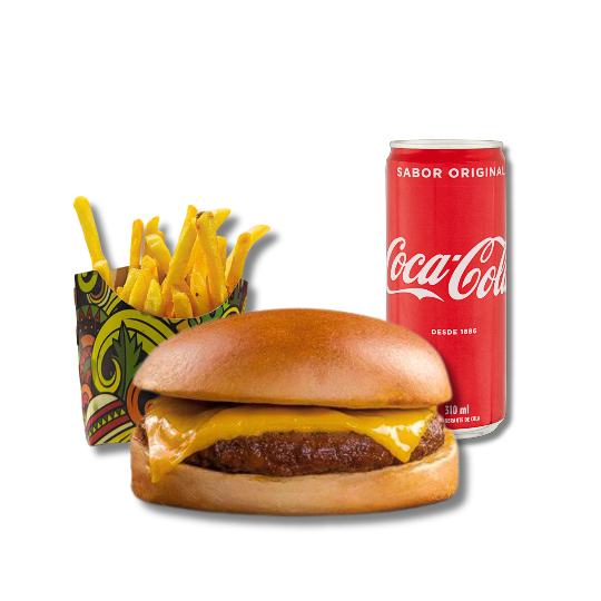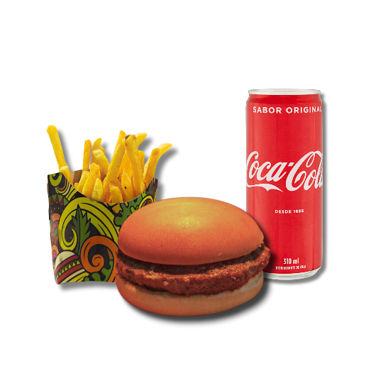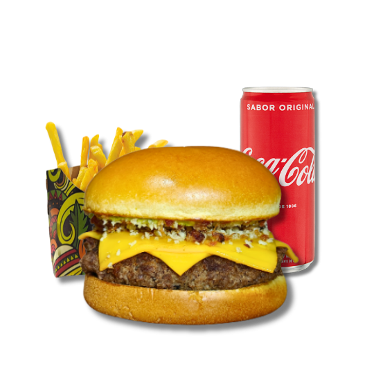 Smash acompanhado de batata frita e bebida à escolha.