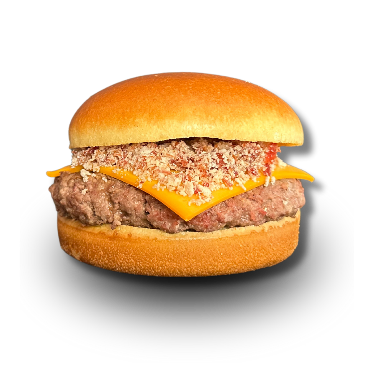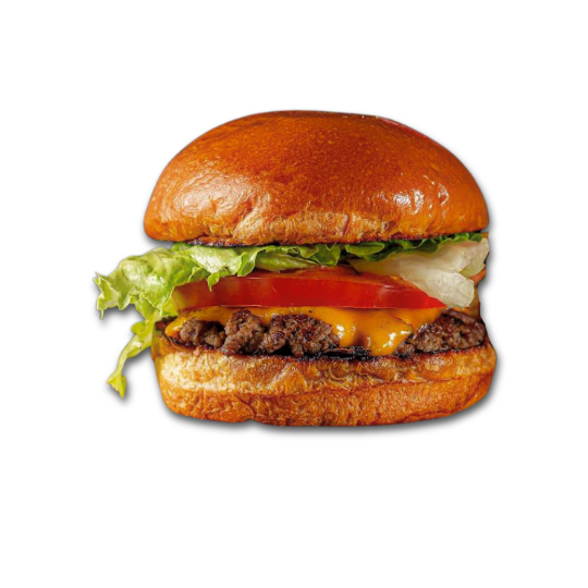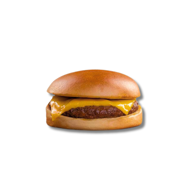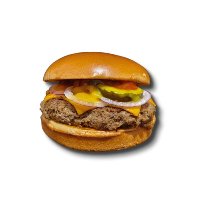 Pão de brioche, smash bovino, e queijo cheddar.