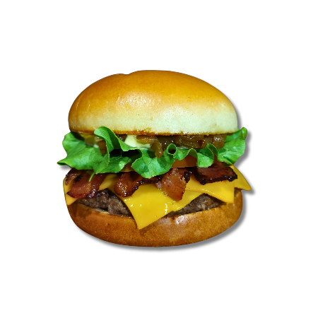 Hambúrguer de 150g, queijo cheddar, alface americana, tomate, cebola roxa, bacon, cebola caramelizada e maionese a escolha.